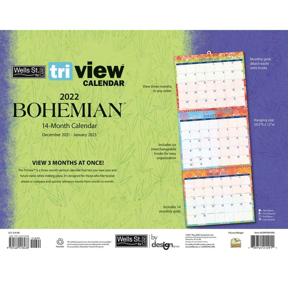 The Bohemian 2022 Plan-It Plus Calendar will keep your family organized with a 17-month calendar grid including 5 individual family member rows 442 reminder stickers and a magnetic planning whiteboard. Artwork by Susan Winget. Wells Street by Lang. Arrange three months in any order from December 2021 - January 2023.